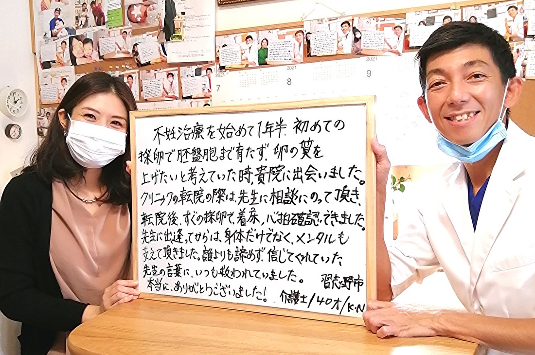 実は、院長自身が不妊治療経験者です。妻が42歳の時に妊娠、43才寸前で無事出産。実際に妻に施術を行い、成功しているから解るその知識と経験を全てお伝えして、最短で妊娠へと導きます。35歳以上でもまだまだ諦めるには早いです。絶対に諦めないでください!