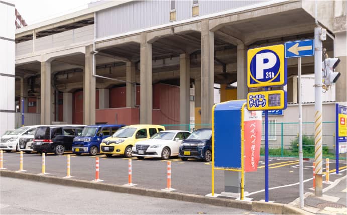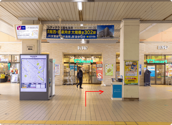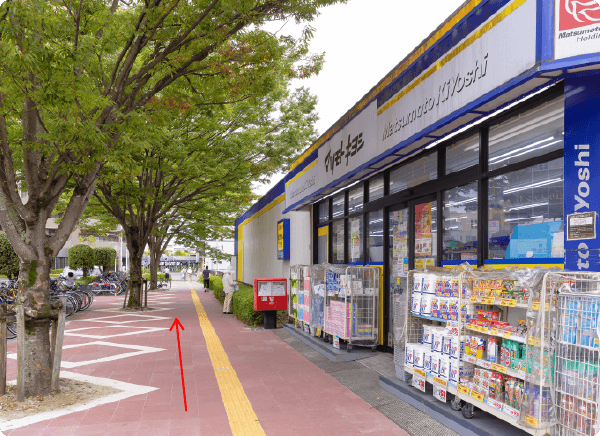駅舎を出て頂くと、右手に薬局「マツモトキヨシ」がございますのでマツモトキヨシの横をとおり、直進してください。