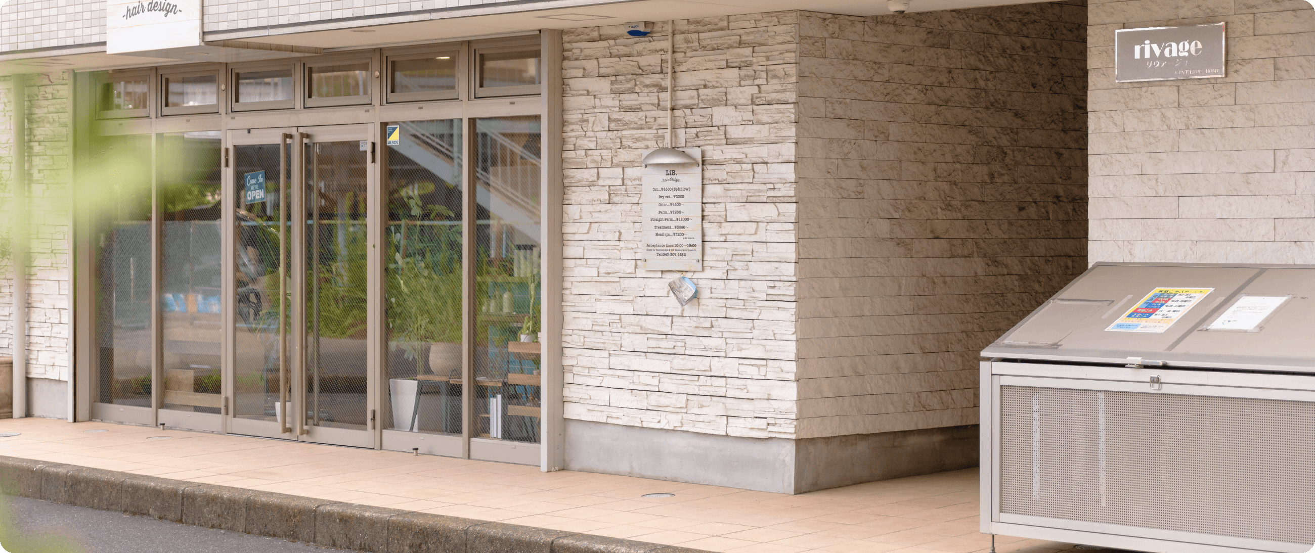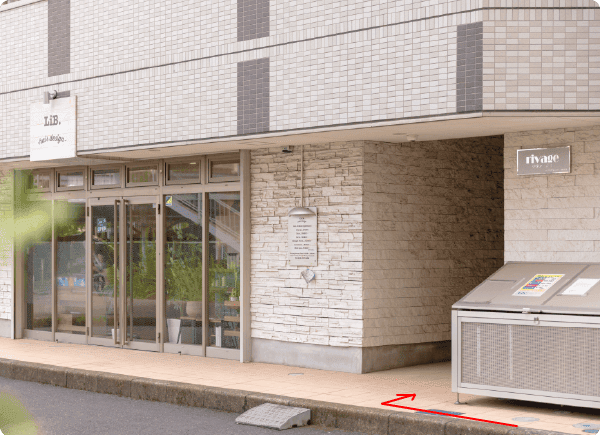 有料駐車場(ザ・パーク)を通り過ぎると、1階に美容室 LIB.がある「rivage/リヴァージュ」マンションがございます。