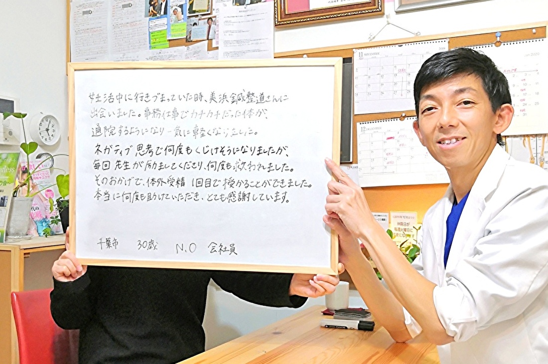お客様の声voice 子宮内膜炎やPCOS患いながらの挑戦!千葉県千葉市 会社員 33歳 S.S様 MORE 流産防止のはり治療にきました。千葉市花見川区 主婦 40歳 S.N様 MORE 流産防止鍼灸に伺いました。千葉市花見川区 主婦 35歳 R.T様 MORE 何度も救われました…。千葉県千葉市 会社員 30歳 N.O様 MORE 通院から約2ヶ月、1回目の人工授精で妊娠!千葉県千葉市 介護 27歳 キャサリン様 MORE 本当に感謝しています。千葉県旭市 会社員 27歳 M.S様 MORE 人工授精5回から体外受精ステップアップ前に自然妊娠千葉市中央区 会社員 31歳 Y.K様 MORE 人工授精前に自然妊娠!千葉県四街道市 会社員 35歳 M.K様 MORE 23456