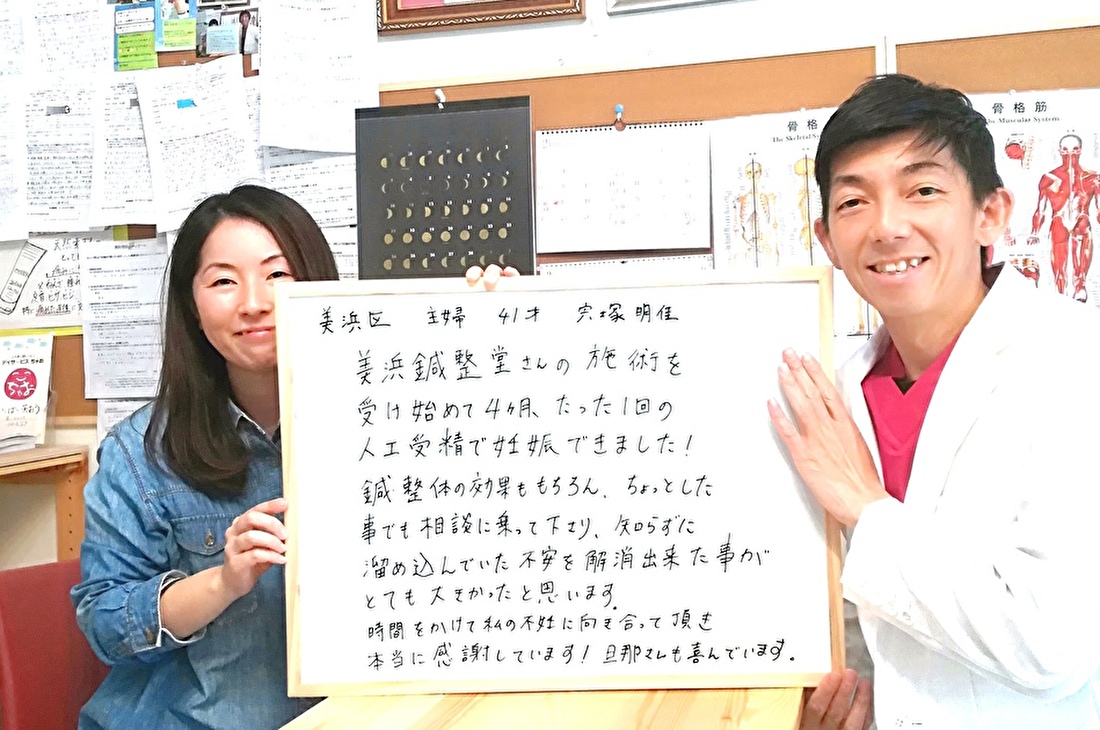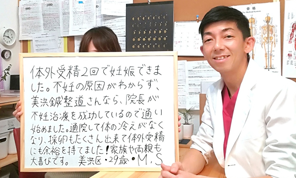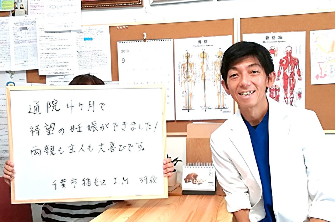 お客様の声voice 1回目の人工授精で妊娠!念願の希望が叶いました!千葉市稲毛区 会社員 31歳 F.N様 MORE 約2か月で待望の妊娠!家族みんなの願いが叶いました!千葉市中央区 会社員 40歳 M.S様 MORE たった1回の人工授精で妊娠できました!不安の解消がとても大きかったと思います。千葉市美浜区 主婦 41歳 S.S様 MORE 通院4ヶ月で妊娠できて、一気に希望が叶いました!千葉市稲毛区 介護士 39歳 I.M様 MORE 2回の体外受精で妊娠!採卵もたくさんできて、余裕が持てました!千葉市美浜区 主婦 29歳 M.S様 MORE 転院後すぐの採卵で着床、心拍確認、妊娠!☆心拍確認後の妊娠安定鍼でご来院☆(高橋ウィメンズクリニック体外受精併用)千葉県習志野市 介護士 40歳 K.N様 MORE 通院後、1回目の人工授精で妊娠!千葉県千葉市 会社員 34歳 Y.F様 MORE 通院わずか5回目で妊娠できました!!千葉県千葉市花見川区 会社員 33歳 R.S様 MORE 3456